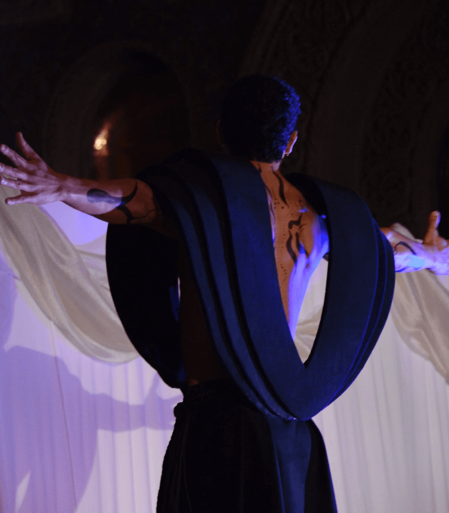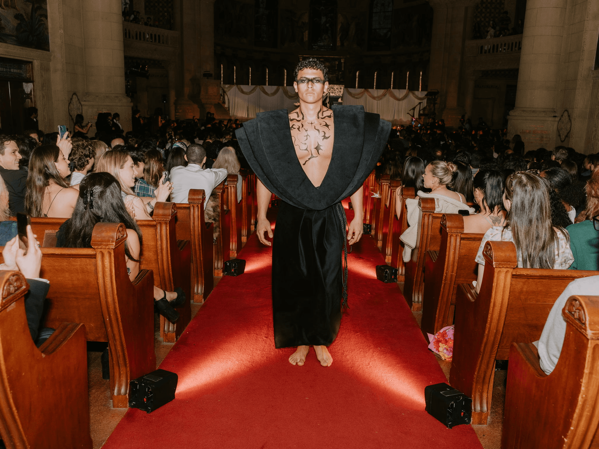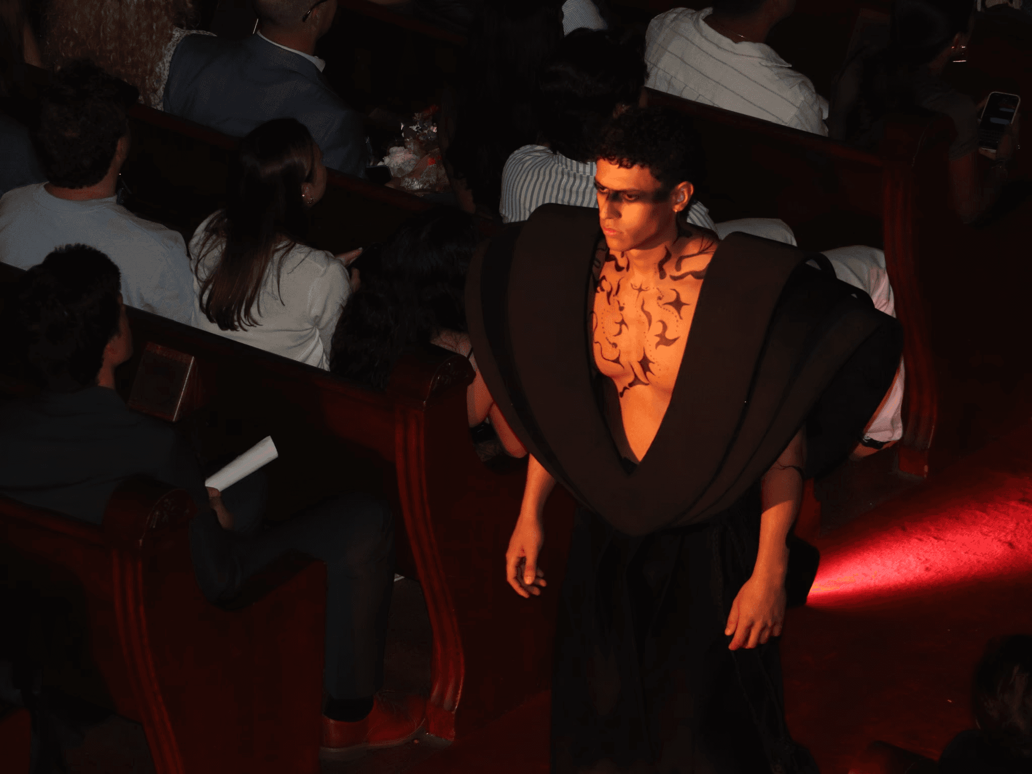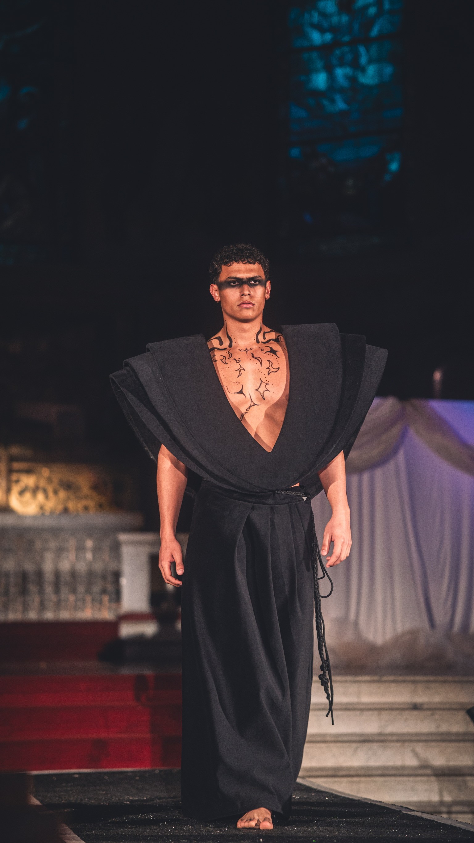 WHATa runway look depicting male strength through vulnerability for the theme "Metamorphosis"